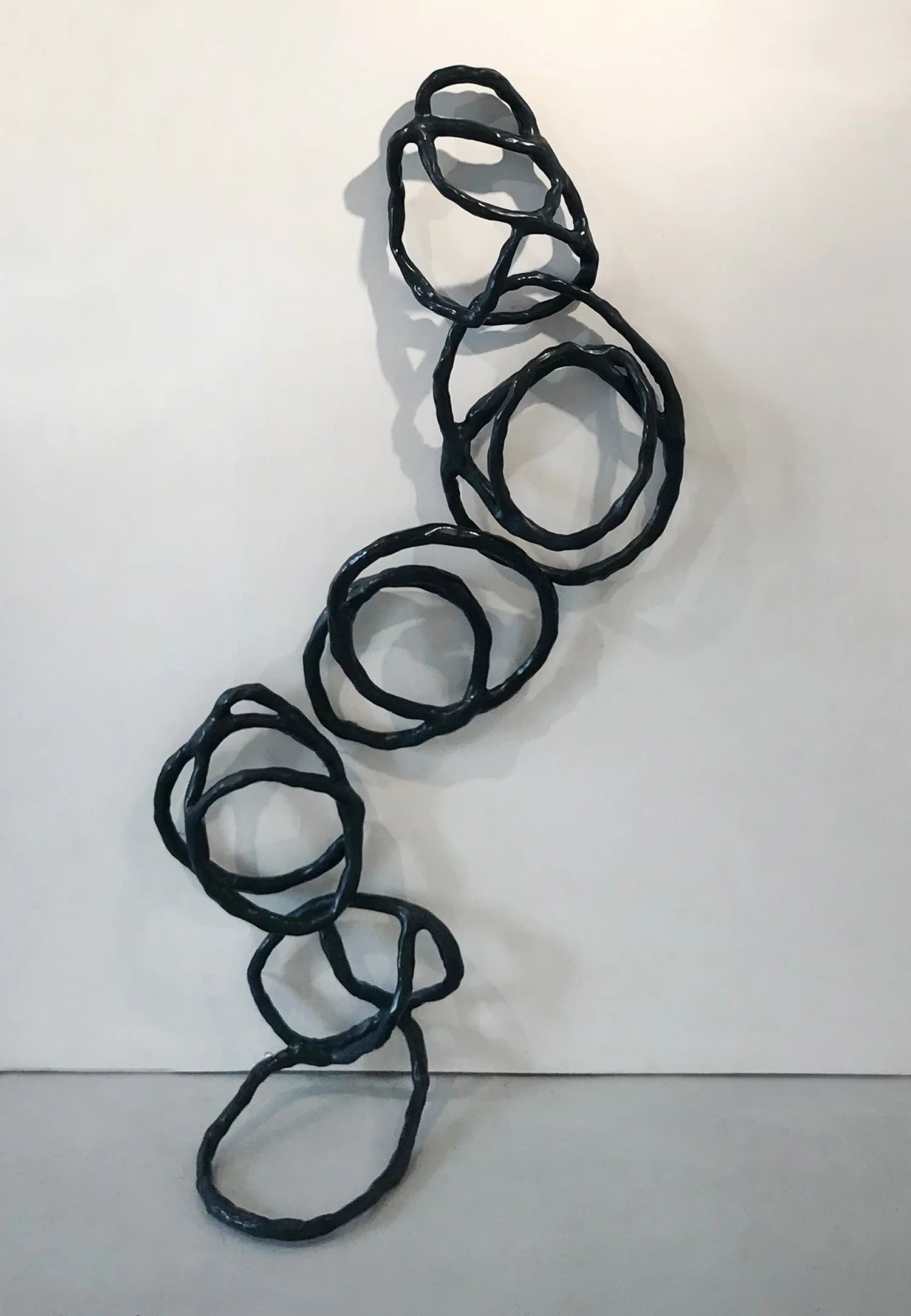 Sinew 3, 2022 (sold) Tin foil, paper mache, wax 30 x 22 inches  For years I have been making drawings of interwoven lines – sometimes these are just doodles, sometimes they are more elaborate. Initially inspired by Manzanita growing on the slopes of